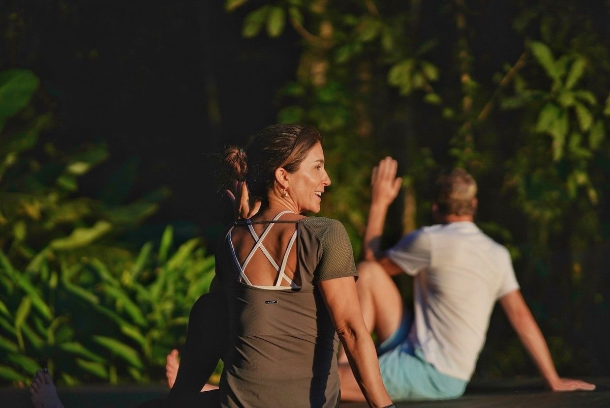 Lady doing yoga near beach at Playa Cativo Lodge